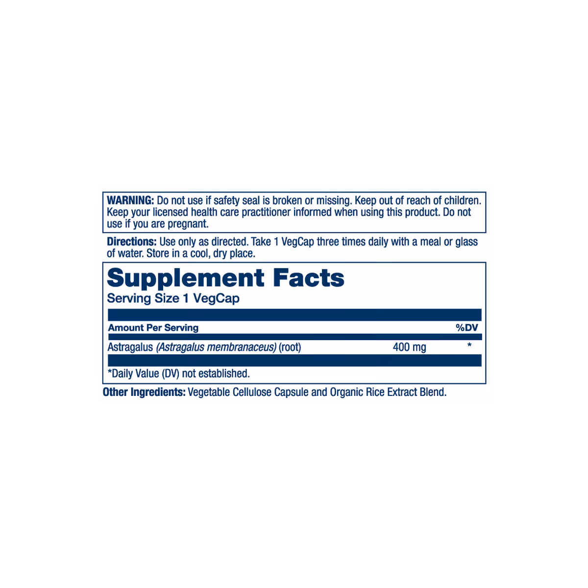 Astragalus (Astragalus membranaceus) (root), Vegetable Cellulose Capsule and Organic Rice Extract Blend.