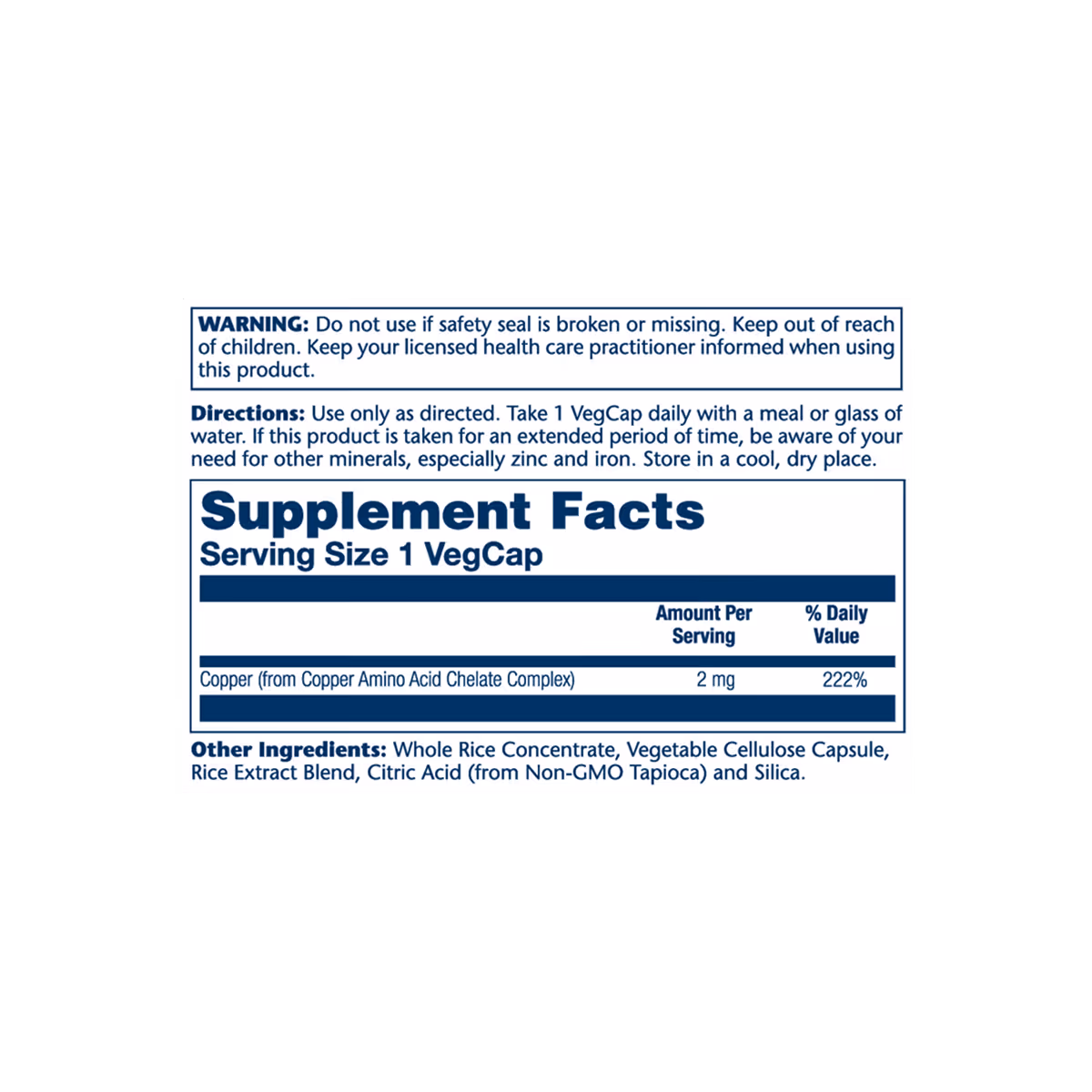 Copper (from Copper Amino Acid Chelate Complex), Use only as directed. Take 1 VegCap daily with a meal or glass of water. If this product is taken for an extended period of time, be aware of your need for other minerals, especially zinc and iron. Store in a cool, dry place.
