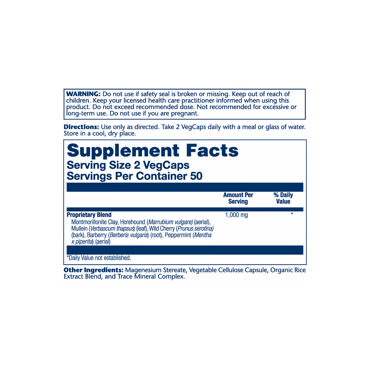 Montmorillonite Clay, Horehound (Marrubium vulgare) (aerial), Mullein (Verbascum thapsus) (leaf), Wild Cherry (Prunus serotina) (bark), Barberry (Berberis vulgaris) (root), Peppermint (Mentha x piperita) (aerial), Magenesium Stereate, Vegetable Cellulose Capsule, Organic Rice Extract Blend, and Trace Mineral Complex.