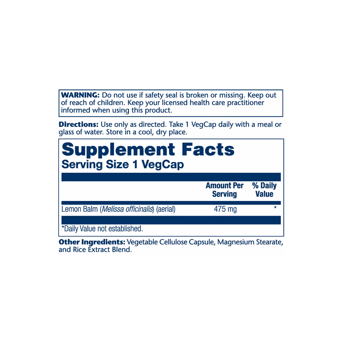 Lemon Balm (Melissa officinalis) (aerial), Vegetable Cellulose Capsule, Magnesium Stearate, and Rice Extract Blend.