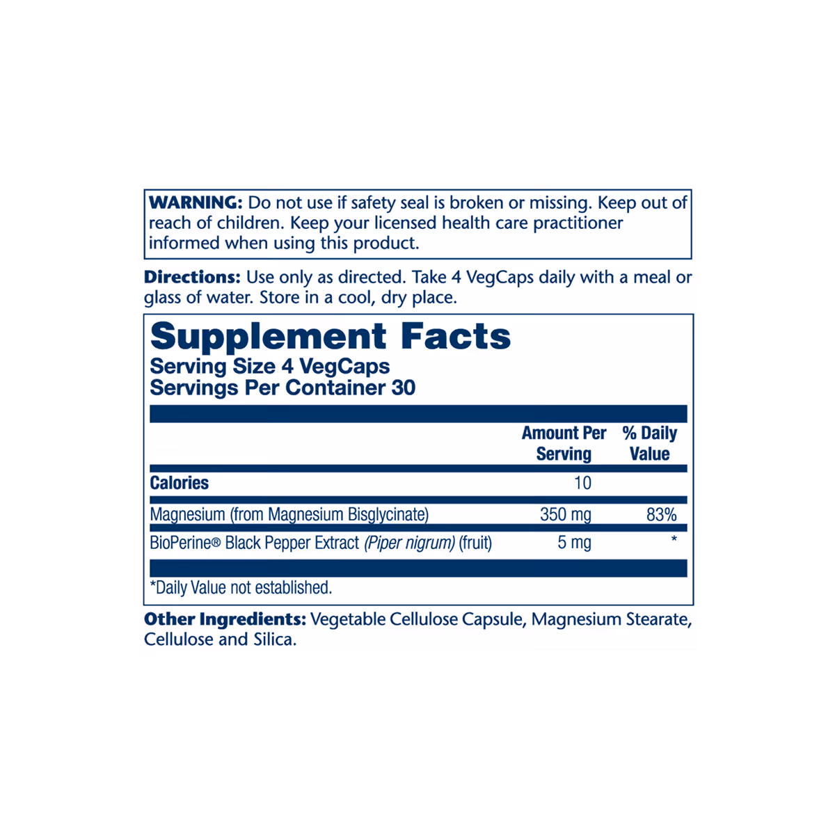 Magnesium (from Magnesium Bisglycinate), BioPerine® Black Pepper Extract (Piper nigrum) (fruit), Vegetable Cellulose Capsule, Magnesium Stearate, Cellulose and Silica.
