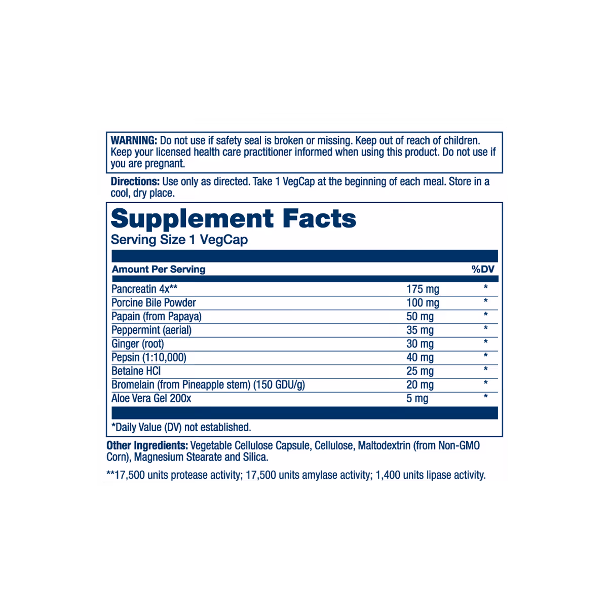 Pancreatin, Porcine Bile Powder, Papain (from Papaya), Peppermint (aerial), Ginger (root), Pepsin (1:10,000), Betaine HCI, Bromelain (from Pineapple stem), Aloe Vera Gel, Vegetable Cellulose Capsule, Cellulose, Maltodextrin (from Non-GMO Corn), Magnesium Stearate and Silica.