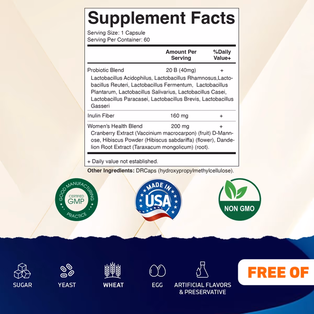 Probiotic Blend (Lactobacillus Acidophilus, Lactobacillus Rhamnosus, Lactobacillus Reuteri, Lactobacillus Fermentum, Lactobacillus Plantarum, Lactobacillus Salivarius, Lactobacillus Casei, Lactobacillus Paracasei, Lactobacillus Brevis, Lactobacillus Gasseri), Inulin Fiber, Women's Health Blend (Cranberry Extract (Vaccinium macrocarpon) (fruit) D-Mann-ose, Hibiscus Powder (Hibiscus sabdariffa) (flower), Dandelion Root Extract (Taraxacum mongolicum) (root)), DRCaps (hydroxypropylmethylcellulose).