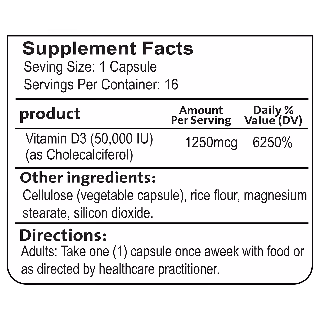 Vitamin D3 (50,000 IU) (as Cholecalciferol), Cellulose (vegetable capsule), rice flour, magnesium stearate, silicon dioxide.